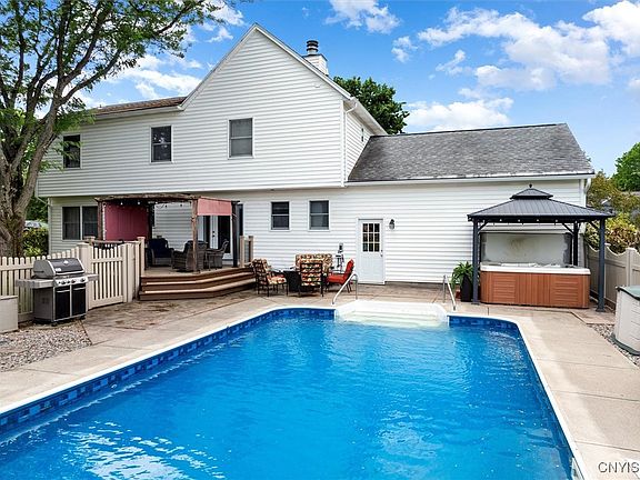 Nestled in one of Oneida's most desirable neighborhoods, this spacious and beautifully maintained and updated home offers over 2,000 square feet of living space designed for comfort and style. Featuring 4 generous sized bedrooms and 2.5 baths. Step into the sun drenched living room where cathedral ceilings and skylights create a bright and airy atmosphere. Large family room with a fireplace. Updated kitchen boasts modern finishes, ample storage and a functional layout. Retreat to the lavish primary suite where the spa inspired bathroom offers a true escape with high end fixtures and an elegant design. The fully finished basement is an entertainer's dream offering extra living space with a 2nd fireplace and a custom bar plus a pool table room! Now step outside to be wowed! A gorgeous inground pool with a large patio area complete with a hot tub and gazebo! This home has the perfect blend of charm, space and updates! Don't miss your opportunity to own a piece of Oneida's finest living! Square footage includes 700 in the finished lower level.