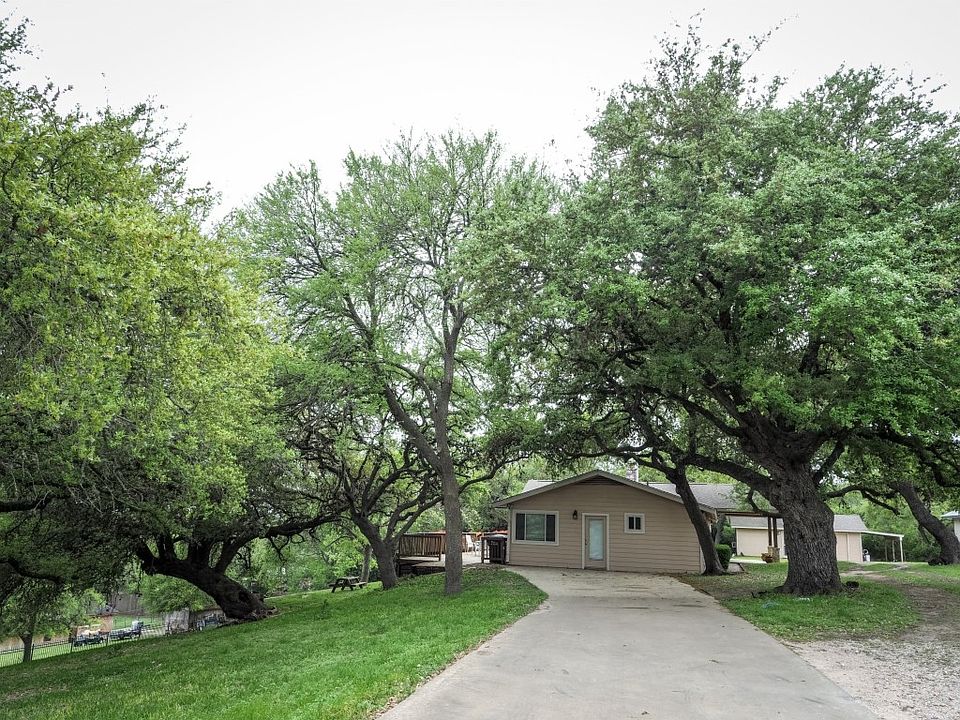 Almost an acre high on a hill with a view! With 2100 sq.ft. plus an air-conditioned shop/craft room, a one car garage with door opener, a one car carport, and a 1000 sq.ft. deck with a view for miles! This beautifully remodeled, energy efficient home backs up to a natural area for privacy and is crowned by multiple, native live oak trees. With three bedrooms, two baths plus a bonus room off the master, this home includes four sides native stone exterior, vaulted ceilings, a massive native stone fireplace, a gourmet kitchen with custom cabinets, granite countertops and a must-see granite island. The large Master suite also opens onto the deck through double patio doors. The Master Bath has a unique, curved glass enclosed tub/shower combo. Custom cabinetry, marble counters, double sinks and mirrored walls. This home offers energy efficient windows, ceiling fans, tankless hot water heater, extra attic insulation, two zoned a/c units and energy efficient lighting. Close to everything!