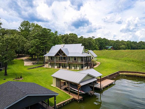 Welcome to 109 King Shore Blvd, a luxury waterfront retreat in Kings Country on Lake Cypress Springs. This nearly 4,000 sq ft, FEE SIMPLE property on a cove offering calm waters, lake views, and a serene setting for full-time or weekend living. The home features four bedrooms total, with three offering private ensuite baths. The spacious primary suite is located on the main level and includes its own fireplace, a sitting area surrounded by windows, a jetted tub, and a walk-in closet. The main living room boasts floor-to-ceiling windows overlooking the lake, a stone fireplace, and wood flooring. The kitchen is designed for both functionality and entertaining, with granite countertops, a center island, and a butler’s pantry. A powder bath, screened porch, and covered deck complete the main level. Downstairs, you'll find two guest bedrooms with ensuite baths, along with the fourth bedroom, a game or media room, a kitchenette, a second laundry area, and an additional half bath. The home is equipped with smart features including Sonos surround sound, automated lighting, waterline leak detection, ADT security, two-zoned HVAC, two 75-gallon water heaters, and two laundry areas. Outside, enjoy a freshly painted exterior, new 2023 boathouse with Trex decking along with a newly installed retaining wall. A detached two-car garage and long concrete drive provide ample parking and storage. This home is being offered fully furnished with few exceptions and includes a golf cart. Located in a gated community with a boat ramp, fishing piers, and tennis courts, this is a rare opportunity for turnkey luxury lake living in one of East Texas’s most desirable waterfront communities.
