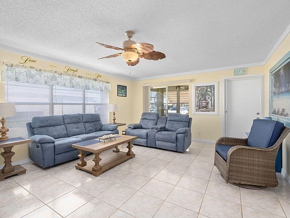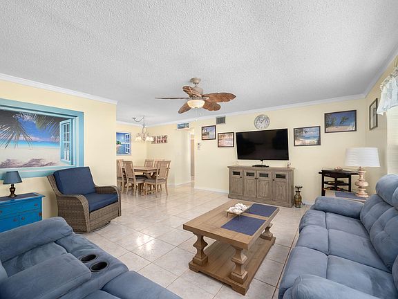 Light & Bright furnished corner unit that is close to POOL & Club House. Tile floors in living areas, indoor/outdoor carpet in FL RM, & carpet in bedrooms. Crown molding throughout, FL RM has AC vent therefore is including in total living area. Electric panel has been changed. Kitchen equipped with all major appliances & features newer Formica counters. Sellers installed additional storage cabinets in Guest Bedroom. AC new in 2016; water pipes are PVC through attic. Accordion shutters on all windows except for front FL RM window which had been changed. Disappearing screen doors on front & back doors. Open Patio with outdoor furniture + grill. Unit is situated on the most western street of HP therefore a canal at the back of the unit. Perfect Seasonal Home & priced to sell quick, Call Now