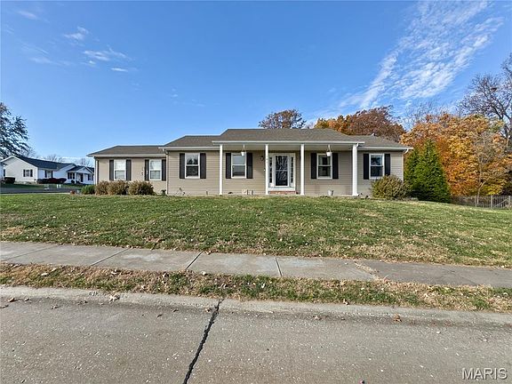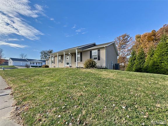 Prime Location with Seamless Commute. Situated just minutes from Bluff Road, this property provides a smooth, traffic-free route to St. Louis, making your daily commute or weekend outings both convenient and stress-free. Inviting Interior Features - Open-concept living and dining areas with luxury vinyl plank flooring, a large picture window, and a stylish shiplap accent wall surrounding the cozy fireplace—ideal for winter evenings and seasonal décor. Eat-in kitchen includes all major appliances: stove, refrigerator, dishwasher, and microwave. The layout encourages casual dining and effortless entertaining. Main floor laundry room with built-in pantry space for overflow storage, conveniently located just off the side-facing two-car garage. Triple built-in bookcases included with the sale, offering both function and character. Recent Upgrades & Energy Efficiency include a new deck with stairs, privacy fencing, and a new swing set, ready for outdoor enjoyment.