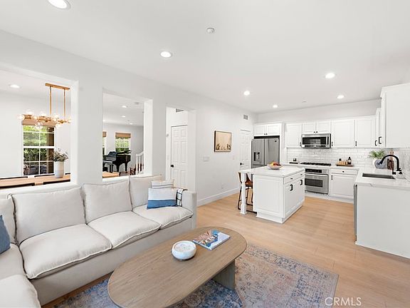 Stunning Corner-End Home with Upgrades Galore in Ladera Ranch! Welcome to 109 Orange Blossom, a beautifully upgraded 3-bedroom, 2.5-bathroom home located in the highly desirable Branches Community of Ladera Ranch. This spacious 2,035 sq ft residence boasts one of the best floor plans in the community, offering exceptional natural light, privacy, and thoughtful design touches throughout. Step inside to find brand-new wide and extra-long white oak luxury vinyl plank flooring with a lifetime warranty, complemented by plush pet-proof and spill-resistant carpet in the bedrooms, featuring Tempur-Pedic padding. The entire home has been freshly painted, and a full PEX repipe was completed in 2020. The open-concept great room and kitchen create a welcoming space perfect for everyday living and entertaining. The remodeled kitchen is a chef’s dream with upgraded quartz countertops, white subway tile backsplash and shaker cabinets, a quartz island, farmhouse sink, stainless steel appliances, and a walk-in pantry — a unique feature to this floor plan. Enjoy custom under-counter lighting, dimmable and color-customizable with smart control, and a boutique-style chandelier in dinning room. Retreat to your spacious primary suite filled with natural light. Both upstairs bathrooms are beautifully remodeled with quartz countertops and custom tile flooring, while the downstairs powder room has also been updated. Larger-than-average secondary bedrooms are a rare find and offer custom touches including wood paneling and custom wallpaper in one, and upgraded lighting in both. Additional Features Include: Custom fireplace and mantel in living room; upstairs laundry room with custom tile; smart dimmable wifi-light switches and plugs throughout; recessed lighting with customizable temperatures settings; Blackout Roman shades on main floor (Bluetooth/remote/voice control), new garage opener motor; water filtration system; and double-paned windows for added energy efficiency and sound reduction. Enjoy the tranquility of a private corner-end unit with no neighbor to the left or behind. Relax on your larger front patio with peaceful mountain views and enhanced privacy. Located in a neighborhood full of kids and life near greenbelts and the Paseo Trail, you’re a short walk to top-rated schools, multiple parks and pools, Terramor Aquatic Park, the Skate Park, Avendale Clubhouse, and Founders Park — home to the weekly Farmers Market and annual 4th of July Festival & Fireworks.