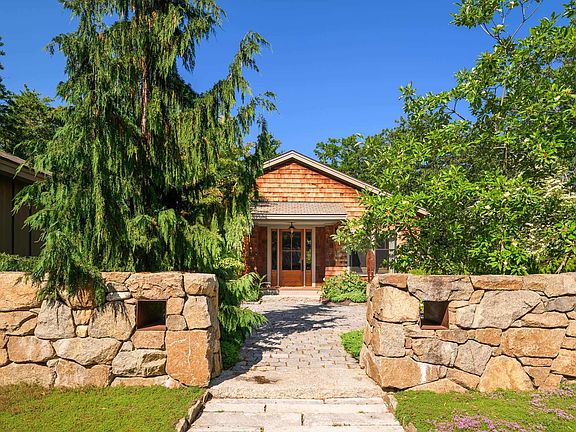 Minutes to downtown Ogunquit, Perkins Cove and the Marginal Way tucked back off of scenic Pine Hill Road in Cape Neddick, is this truly unique, custom built, California inspired home. From the stone walls, to the ornamental trees and gardens, to the patios and terraces, no landscaping detail was overlooked. Natural wood interior doors, hand-crafted wall coverings, trim-work, custom cabinetry, accent beams and solid white oak flooring create a warm and comfortable rustic chic ambiance throughout the home. The high-ceilinged open-concept floor plan includes a spacious living, dining and kitchen with French limestone and butcher block countertops, perfect for hosting large family and friend gatherings. Off the kitchen is the four-season, radiant heated sunroom ideal for enjoying the privacy of this idyllic setting. The main level of the home is complete with a powder room, walk-in pantry and the primary bedroom suite with balcony overlooking the backyard. Two guest bedrooms with dedicated outdoor patios, a guest bathroom, additional laundry space, media room and fully equipped second kitchen comprise the in-law suite on the lower level of the home. Other notable home features include an oversized two-car garage, Marvin doors and windows, Heos sound system, Generac whole house generator, hydro air heating and central cooling, irrigation system and custom-designed shed readily converted for home office, work-out or hobby space. This private sanctuary situated on 5.43 acres.