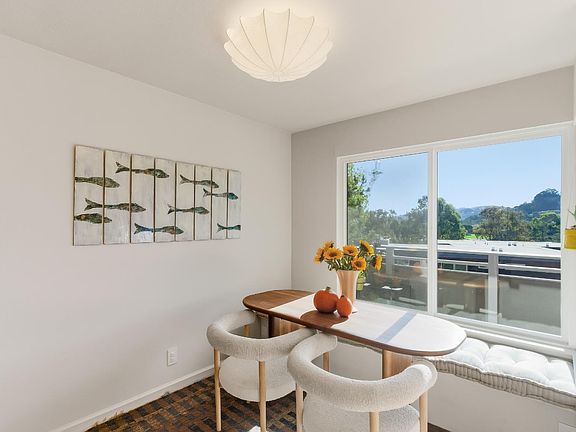 This sweet 2 bedroom, 2 bath end-unit condominium home offers rare privacy, featuring the building's largest side yard and a deck that overlooks lush hills and the Corte Madera Town Park. The open-concept living/dining and kitchen areas flow seamlessly to a balcony that fills the rooms with natural light. The primary suite offers a peaceful retreat with en suite bath, direct access to a private patio, and a side entrance that makes indoor-outdoor entertaining a breeze. The second bedroom enjoys serene outlooks of lush greenery, complemented by a full bathroom that also serves the main living areas. Located near top schools, scenic hiking/biking trails, the Town Park, restaurants and with easy access to the freeway, this home offers the best of Marin living.