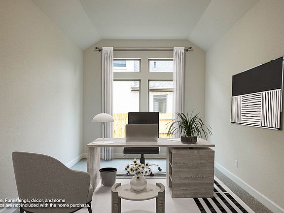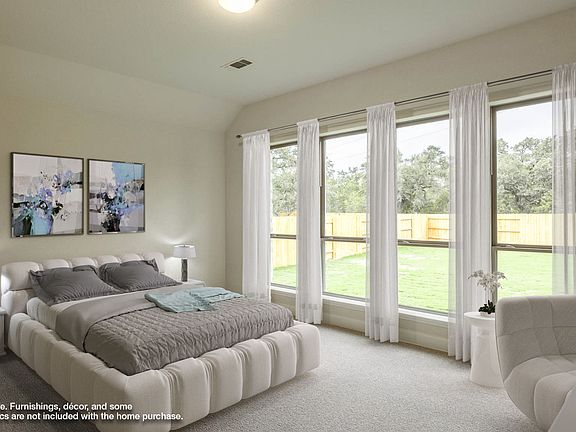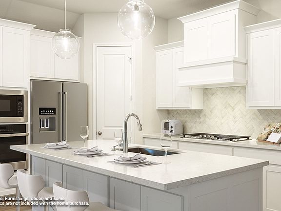Welcoming entry features 12-foot ceiling. Open kitchen offers generous counter space, corner walk-in pantry, 5-burner gas cooktop and inviting island with built-in seating space. Dining area flows into open family room with wall of windows. Game room with French doors just across from kitchen. Primary suite includes bedroom with wall of windows. Dual vanities, garden tub, separate glass-enclosed shower and two-walk in closets in primary bath. Guest suite includes full bath. Abundant closet space throughout. Extended covered backyard patio. Mud room off two-car garage. Representative Images. Features and specifications may vary by community.