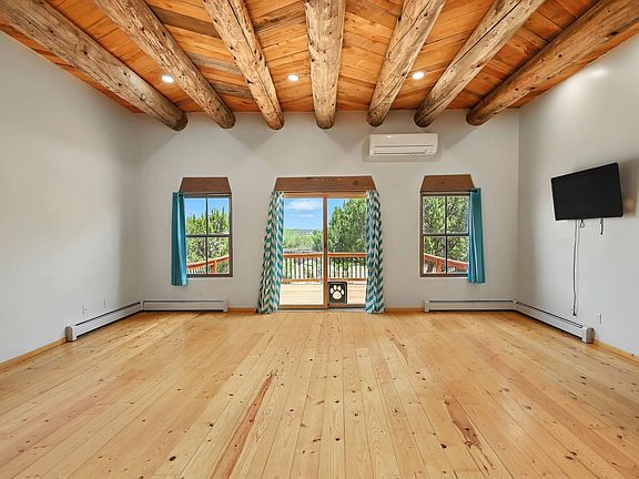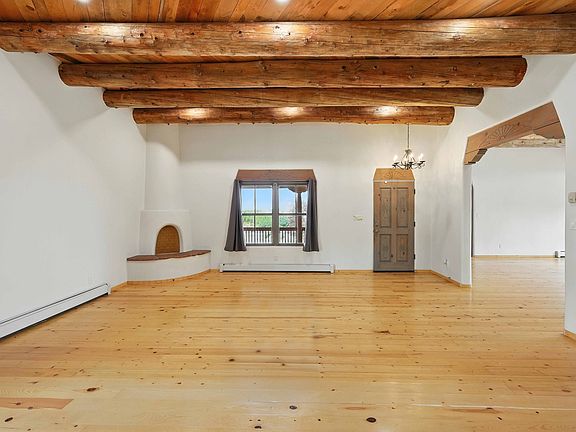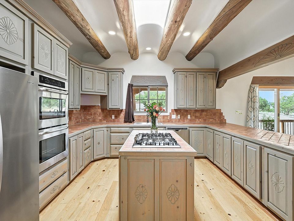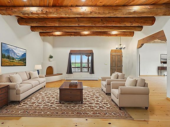 Experience Southwestern charm, stunning landscapes, and unmatched tranquility nestled in the sought-after Las Lagunitas community. This thoughtfully designed 4-bedroom, 2.5-bath custom home sits on 1.26 acres of beautifully landscaped property, featuring vibrant roses, lilacs, butterfly bushes, and mature trees that bloom until the first frost. Step inside to an open-concept layout filled with warmth and character, from natural wood vigas throughout to custom barrel ceilings in the chef’s kitchen which features rich custom cabinetry, double ovens, a pantry, and beautiful built-in nichos. The spacious master suite boasts a luxurious soaking tub with peaceful mountain views, a massive walk-in closet, and direct access to the expansive wrap around patio.Three additional bedrooms, including a versatile 4th bedroom/den provide flexibility and function with abundant storage including a generously sized garage with full shelving and a circular driveway for ample parking. Outdoors, choose between the open-air deck or the covered patio, offering panoramic views of mesas, mountains, hills, and those unforgettable Santa Fe sunsets painted in turquoise, pink, and gold. Nature lovers will adore the visits from hummingbirds, roadrunners, robins, and playful rabbits. Las Lagunitas offers quiet, secure living with gated entry, natural walking trails, a picturesque gazebo & pond, and a true sense of community. Homes are thoughtfully spaced for privacy while maintaining a welcoming neighborhood feel. Location Perks: Commuters will love the easy access to I-25 and the Frontage Road, making travel to Los Alamos National Laboratory, downtown Santa Fe, and Albuquerque fast and efficient—ideal for lab employees or anyone seeking peace without sacrificing proximity.