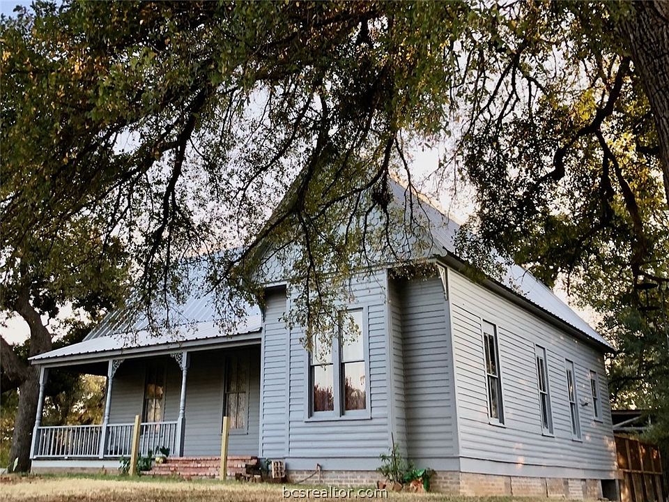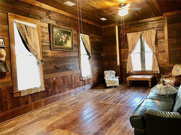 Historic, one-story farmhouse, built in the late 1800s, is situated on a 1 1/2 corner lots in Calvert, Texas. This home offers a warm ambiance with large, spacious rooms, high ceilings, original wood floorings with reclaimed antique lumber and bead board throughout the home. The front of the house boasts a large, covered porch with a front door that opens into a large family/gathering room for entertaining. To the right of the entrance, another large room makes way for a large, open concept area with kitchen, breakfast/dining and bonus gathering area. The bonus area was once separated by an interior wall and could be converted back to create a bedroom/study/guest space. Other notable features in this home include updated electrical and plumbing, central a/c and heat, metal roof, large backyard deck/patio off the kitchen. A covered barn/shed structure stands at the back of the property for storage and more. Centrally located between Bryan/College Station, Temple, and Waco, this home is just 35-40 minutes to Texas A&M University and 55 minutes to Baylor University. Schedule an appointment to tour this charming, one-story home just a few blocks away from Calvert's Historic Main Street.