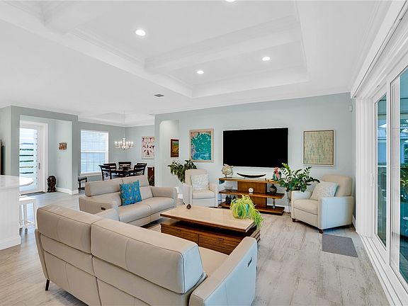 Lakefront luxury meets peace of mind in this stunning 3BR/3BA home with a 3-car garage and whole-house generator. Enjoy sleek interiors, high-impact glass and full storm protection. Entertain in the open-concept kitchen and living spaces or relax by the 2022 built Solar heated saltwater lap pool. or dine on the covered patio overlooking the lake. Impeccably designed with modern finishes, abundant natural light, and serene views Impeccably maintained with custom landscape lighting, New Porcelain Tile, trayed Ceilings Throughout the home.This home blends elegance, safety and resort-style living.