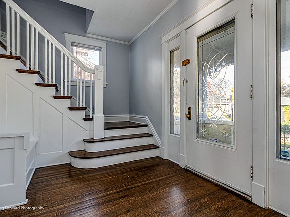 Calling all "Old & Charming" lovers who secretly want an updated kitchen & baths too! Well, here it is! Enjoy the best of both worlds in this grand beauty! A large covered front porch with beadboard ceiling is the perfect place to start or end your day! The foyer boasts gleaming hardwood floors that flow throughout the main floor, a built-in boot bench, crown molding and columned entry into living room. The living room has a ceiling fan/light and columned entry to dining room. The dining room offers a stunning leaded glass window and large built-in hutch. The updated kitchen has shaker style white cabinets, granite counter tops and SS appliances~1/2 bath on main floor~The convenient mudroom is located off kitchen and has another built-in cabinet and beadboard ceiling. The first floor bedroom has crown molding and ceiling fan/light. Four more bedrooms upstairs with ceiling fan/lights and 2 with crown molding. The gorgeous hall bath has oversized marble look tile floor and tub surround, dark gray vanity with medicine cabinet above. The upper hallway offers a built-in linen cabinet~laundry chute~Pull down stairs to attic. Full basement with floor to ceiling brick fireplace and abundant storage. Two car detached garage with parking area. Huge yard with mature landscaping! The convenient location is close to downtown Joliet, and routes 30 & 52! Come and add your finishing touches and enjoy life!