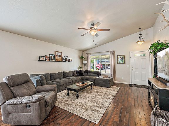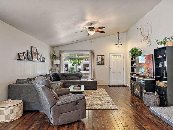 Charming home with mountain views, in the desirable Foothill Estates neighborhood. One of the largest homes in the subdivision at 1464 sq ft, 3 bedrooms, 2 full baths. You will feel right at home from the cozy front porch to the inviting open floorplan featuring beautiful hardwood floors, vaulted ceilings, kitchen with granite counter tops, double ovens, new sink & disposal, breakfast bar & pantry. The spacious primary bedroom has large walk-in closet & bath with tile shower & 2 sinks. Relax in the fenced back yard in the included hot tub, do some gardening in the raised beds or just enjoy the mountain views from the covered patio. The 2 car attached garage has a mini split system for heat & a/c! Enjoy the community of Foothill Estates in one of the 2 parks or on the greenway! HOA also includes maintenance of common areas, sidewalks & street sweeping. Not many come up for sale in this lovely neighborhood, so don't let this one slip by!
