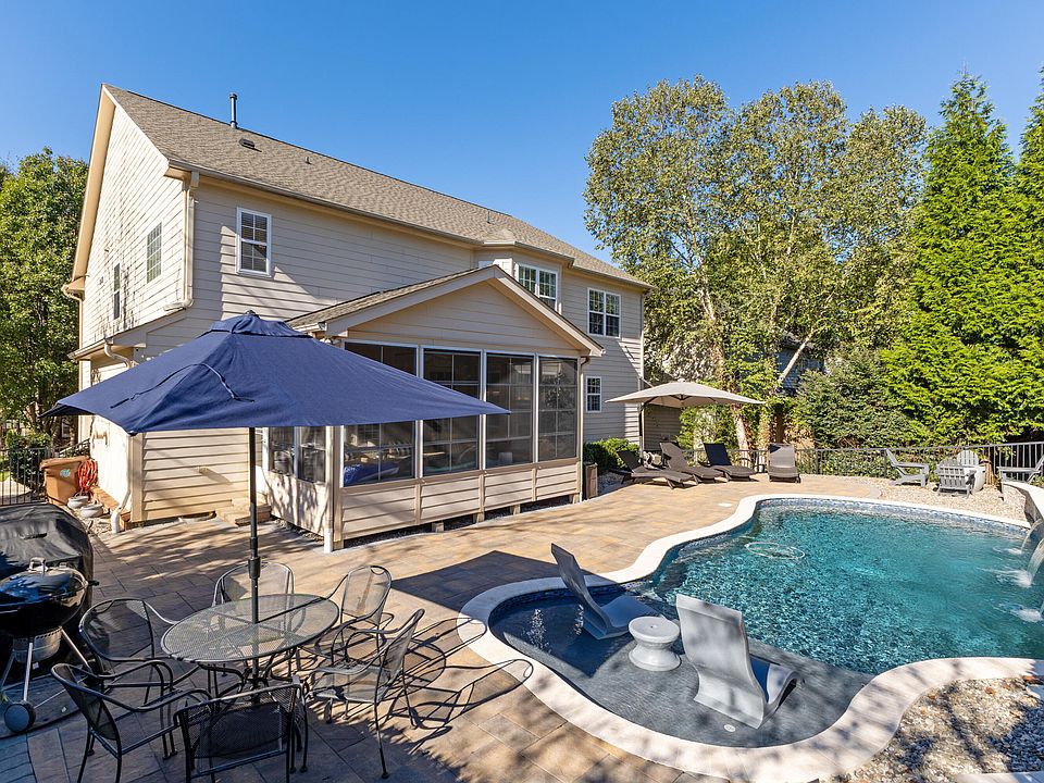 Elegant and spacious 4-bedroom home in the highly sought-after Sunset Oaks, featuring a private in-ground saltwater pool with landscaping, lighting, and phone-controlled heating & cooling. Main level features an expansive foyer flowing into the private office/den, dining area, gourmet kitchen, and family room. Kitchen includes stainless steel appliances, granite countertops, wall oven, island, and an ample walk-in pantry. Family room has custom built-ins, a gas-log fireplace, access to the screened-in porch with EZ-Breeze windows. Second level features a huge entertainment area, wide primary suite with dual walk-in-closets, bath with Jacuzzi jet tub, and dual vanity. 2 bedrooms with jack-and-jill bath, 4th bedroom with an en-suite bath, and laundry room with sink. Community also has tennis, pickleball, clubhouse, camps fitness center, and a community pool for a separate membership. This home is priced to sell, offers an extremely wide and roomy open layout, gorgeous outdoor living, and a vibrant neighborhood/community. Come see it while you still can!