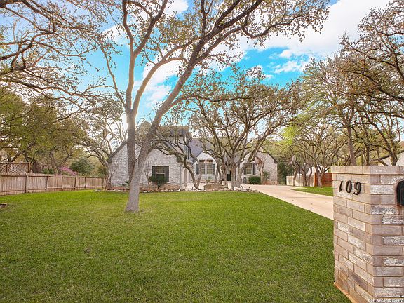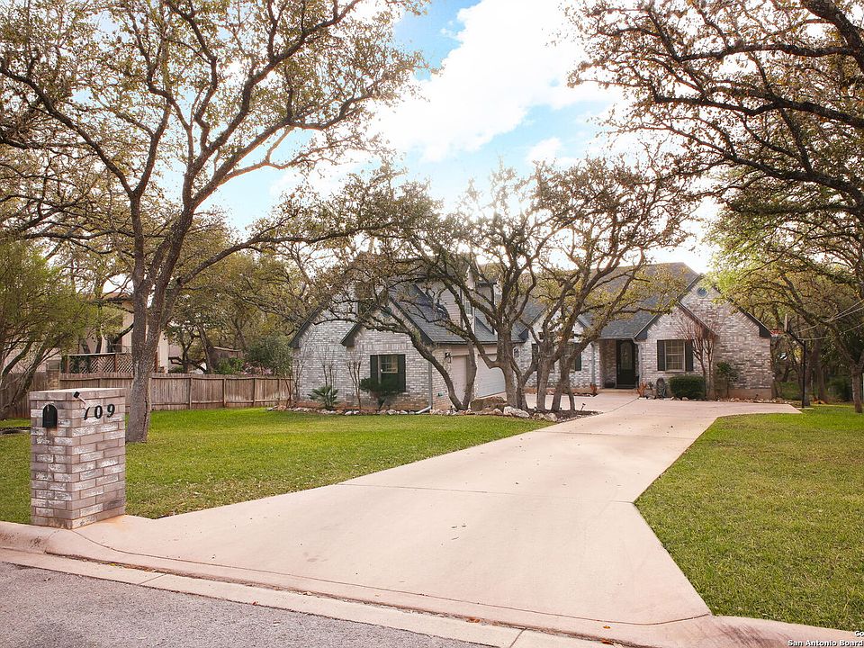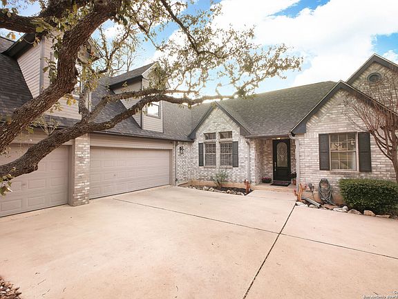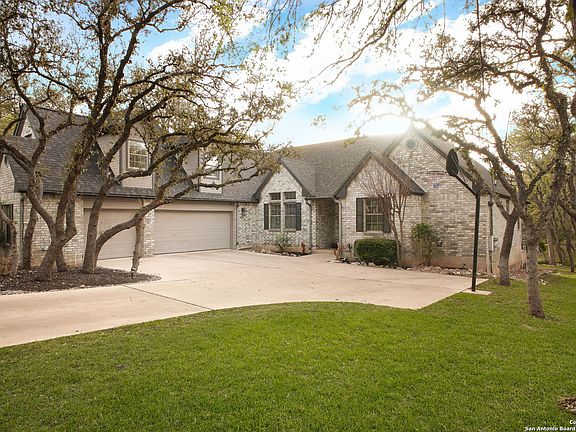 This home is a former Spurs players home #30, Paul Griffin (1979-1983) standing out from the other homes w custom 9 Ft doors and tall ceilings. Nestled on a picturesque half-acre lot in the heart of Hollywood Park, this stunning 1992 custom-built home offers the perfect blend of privacy, elegance, and convenience. Designed for a former San Antonio Spur, this one-and-a-half-story, all-brick residence is a nature lover's paradise, boasting over 50 mature live oak trees and backing up to a tranquil greenbelt. With double patios and breathtaking views, this property provides a peaceful retreat while remaining just minutes from city amenities. Step inside to discover an open floor plan with soaring ceilings, 8-foot interior wood doors, and abundant natural light. The spacious living area features a charming brick fireplace and built-in storage, seamlessly connecting to the formal dining room and eat-in kitchen. The kitchen is a chef's dream, showcasing an all-brick hearth alcove surrounding the cooktop, double ovens, granite countertops, a center island, and a built-in multipurpose desk. The well-designed split floor plan offers exceptional privacy, with a generous primary suite on the north wing of the home. This serene retreat features floor-to-ceiling windows, access to a private patio, dual walk-in closets, a double vanity, a jacuzzi tub, and a separate walk-in shower. On the opposite end of the home, two spacious guest bedrooms share a Jack-and-Jill bath. The large laundry center includes a utility sink, storage closet, and additional cabinetry for convenience. Above the attached three-car garage, a private guest suite with a full bath and walk-in closet offers flexible space for visitors offering two primary en suites Which is rare for this Hollywood Park neighborhood. Throughout the home, wood and tile flooring add warmth and character. Recent updates include a new roof (2024), new septic aerator (Dec 2024), 5-ton compressor (2024), new air handler (Dec 2024), and a new water heater (2024). Hollywood Park offers an incredible lifestyle with a $5 million resort-style facility featuring a clubhouse, covered pavilion with grills, three pools, a splash area, a playground, two tennis courts, a full-size basketball court, and a sand volleyball court. The neighborhood hosts over 20 community events throughout the year, including Santa personally delivering gifts to homes, a Fourth of July parade, Halloween festivities, Easter celebrations, Cookies with Santa, back-to-school and end-of-the-year swim parties, and so much more