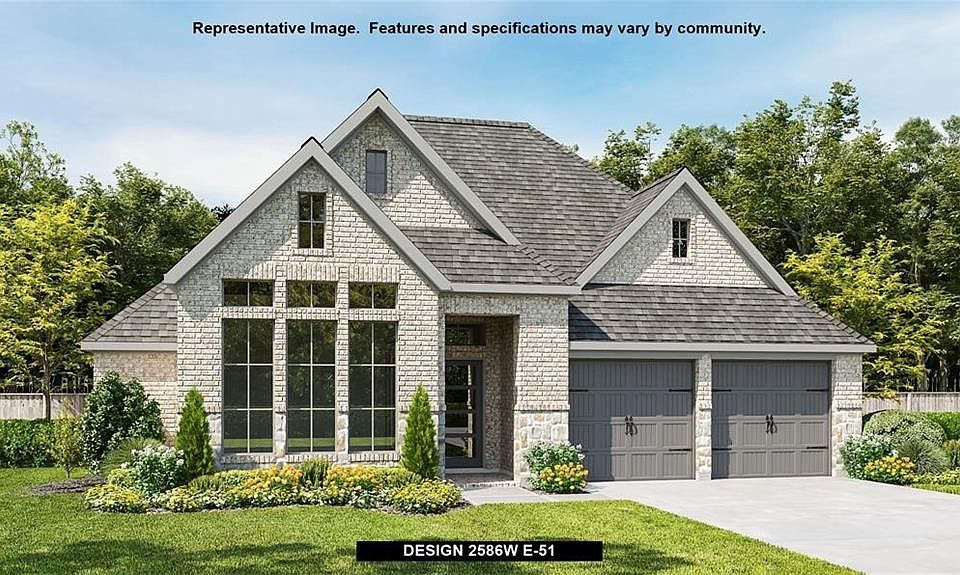 Perry Homes New Construction! Home office with French doors set at entry with 12-foot ceiling. Open kitchen offers generous counter space, corner walk-in pantry and inviting island with built-in seating space. Dining area flows into open family room with a wood mantel fireplace and a wall of windows. Spacious primary suite. Double doors lead to primary bath with dual vanities, garden tub, separate glass-enclosed shower and two walk-in closets. Guest suite. Walk-in closets in all bedrooms. Extended covered backyard patio. Mud room off two-car garage.