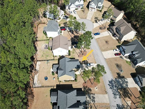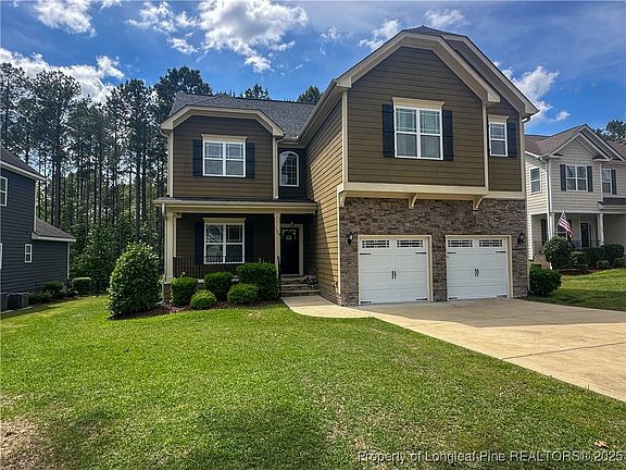 Nestled in the desired gated Anderson Creek Club golf community, you will find your new home on the end of a quiet double cul-da-sac. This two story meticulously maintained home offers a thoughtfully designed floor plan with 4 bedrooms and 2.5 bathrooms. Step inside a large entryway to be greeted by your formal dining room wrapped in wainscoting and a gorgeous ceiling. The kitchen has an abundance of cabinetry, stainless steel appliances, including a gas stove, granite countertops and a center island. The kitchen opens up to a large great room with a beautiful gas fireplace centerpiece. Step out to your large screen porch to take in the views on your fenced-in, private wooded lot. The oversized flat backyard is an oasis for little ones or 4 legged friends. Head upstairs to find a spacious loft at the top landing for a small office or play space. The oversized primary bedroom boasts trey ceilings and large custom his and her closets. The newly renovated primary bathroom features brand new tile flooring, brand new frameless glass shower with an upgraded shower head and jetted bathtub for the utmost relaxation. Two additional bedrooms and a huge bonus room (4th bedroom) all feature large closets. Laundry is a breeze with a large laundry room with a utility sink upstairs. The two car double door garage features storage shelves as well as above garage storage with a pull down ladder, a game changer for holiday decor and military gear. The HVAC was recently replaced in Spring 2022 and includes two nest home thermostats for convenience and energy saving as well as the water heater in 2022. The sprinkler system was upgraded in 2024 with more water efficient heads for the perfect green lawn. A French drain was installed to alleviate any drainage issues. Enjoy the community amenities including a gym, pools, splash pad, playgrounds, dog park, running trail, paddle boats, fishing and duck ponds, and a daycare located within the community and charter school minutes from the gate. Located just 10 miles from Ft. Bragg this home is both convenient and serene.