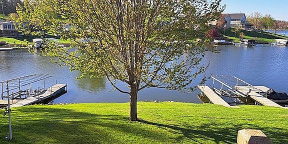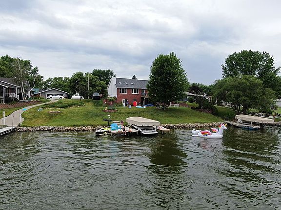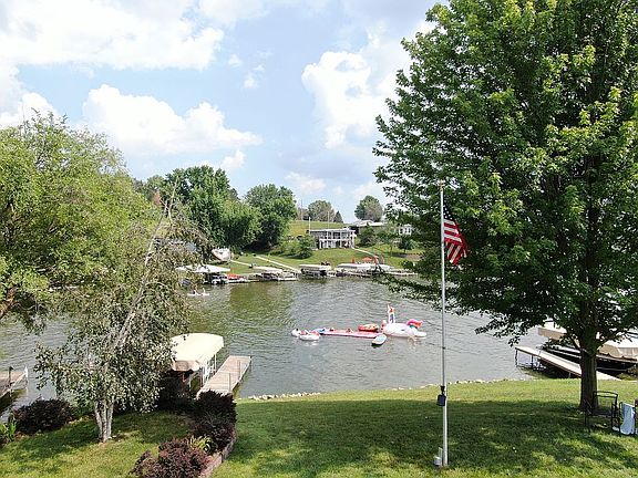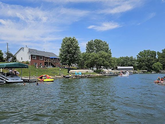 Beautiful custom built brick home with 130' of LAKEFRONT in Southern facing no-wake cove just off the main channel. This 3000+ finished square foot home sits on two lakefront lots on a cul-de-sac. Dock with boat lift included. Spectacular views from newer deck, lower patio, kitchen, family room or large flat lawn. Deck has permanent gas grill. Great outside evening LED lighting and landscaped stepping stone steps on south side. Fire pit area. This two story house is finished on both levels. Upper level has large family room (with vaulted ceiling, skylights, and gas fireplace), kitchen, dining area, living room, 2 bedrooms with baths, office/sleeping area, and large closets. Lower level has a game room with a wet bar and drinking fountain, 2 bedrooms with baths, laundry area, and huge closet or more sleeping area! Double stall attached garage. New roof in 2020. Upper level has glass sliding doors opening onto deck and lower level features sliding doors onto a cement patio. Below the garage is a finished, climate controlled lake toy's storage room....no mildew! This house is built solid with no add-ons. It is a must see home that can easily sleep 4 families,