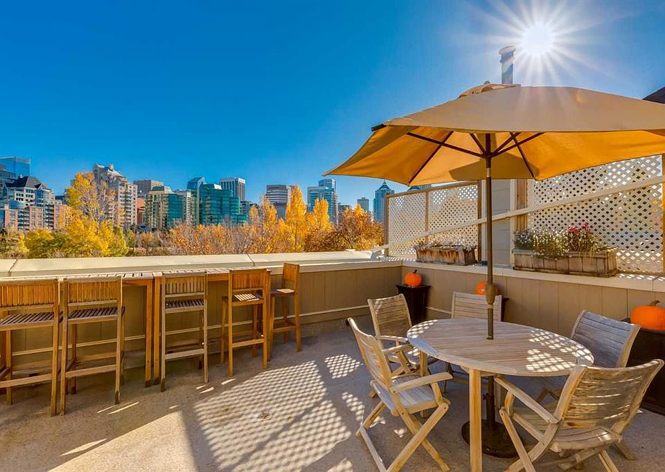SUNNYSIDE townhome along the BOW RIVER with DOWNTOWN VIEWS. Located in a small enclave of 10 townhomes, this inner city home has had numerous updates over the past 10+ years. With 1948 square feet of living space over four levels, there are 2 bedrooms and 2.5 baths plus an exceptional top floor loft space with vaulted ceilings adjacent to an outstanding 20” x 16” roof top patio. The views of Calgary's city skyline are truly exceptional. The home has newer windows & doors, plus the decking surface has been replaced. The custom kitchen includes Makore cabinetry, large island and stainless appliances, including a Wolf gas stove. There is hardwood flooring on three levels, tile in the foyer and bathrooms, quartz countertops, chrome finish hardware, updated light fixtures, built-in entertainment cabinets in living area, air conditioning, and a two 2-sided gas fireplace with remote control. The lower level is developed, including a four piece bath. The Sierras Riverside in Sunnyside is a one of a kind condominium in a vibrant walkable and bikeable location with restaurants, retail, transit, and the Peace Bridge steps away.