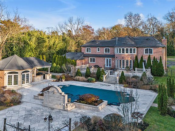New to the market in one of Brookville's most prestigious corridors and locations within the Jericho School District, 109 Wheatley Road offers timeless elegance on 2 flat, beautifully manicured acres. Featuring an unmatched resort-style backyard, the property includes a salt-water swimming pool, hot tub spa, expansive travertine marble patio, professional bocce ball court with seating, vegetable garden, and separate all brick pool house with outdoor kitchen and pizza oven. The west-facing backyard offers beautiful sunset views, with colorful landscaping year-round and mature nectarine and fig trees lining the garden. Set back far from the road for exceptional privacy, the home also offers a three-car garage plus generous courtyard and side parking. This stately, full brick colonial welcomes you with a grand two-story front to back entrance foyer that sets the tone for gracious living throughout. Music room and den flow nicely to the library/study. The home features 6 bedrooms and 5.5 baths. Formal great room with gas fireplace and a banquet sized dining room with mural accommodates larger dinner parties. True chef's kitchen, 6-burner gas Wolf range with double oven, two dishwashers, two sinks, centre island seating plus breakfast room with french doors to the backyard. Natural gas for heating and cooking. Unfinished basement with 10' ceilings, steel beam construction, engineered floor beams and outside entrance. The pool house has a basement, too. Just imagine yourself living and entertaining here on this private estate. Easily accessible to major roads and just minutes from the Long Island Expressway, shopping, restaurants, parks, country clubs, train transportation and quick to the international airports in New York. The Village of Brookville on the North Shore of Long Island offers residents a supreme lifestyle, and this house is solidly built to enjoy on day one.