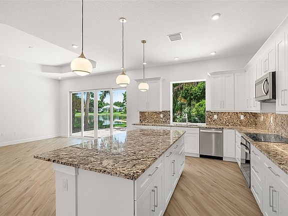 Stunning new 4BD/2.5BA CBS home, gated community, remarkable lake views, 8’ impact doors, high ceilings, Mirage Italian porcelain floor, gourmet kitchen offers Whirlpool appliances, 36” cooktop, & 4x8 exotic blue granite island. Entertain with a wet bar topped in Smokey Mountain granite. Home includes walk-in closets, tankless water heater, metal roof, 2 attic storage areas, & epoxied 2-car garage. Relax on the spacious patio or design a beautiful pool. Timeless charm meets the strength of stucco in this home, with a finish expertly crafted to mimic the look of classic horizontal siding.