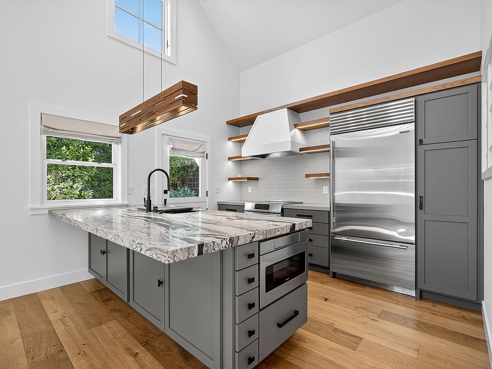 ADU space is gorgeously remodeled, with a chef's kitchen, high end SubZero stainless steel appliances, and vaulted ceiling outlooking the backyard space. The ADU serves as either an entertainment area, office, or separate guests quarters.