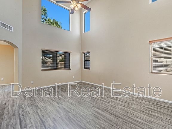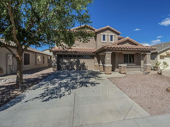 No Application Fees! Beautiful 4 bedroom, 3 bathroom home located in the highly desirable Johnson Ranch community. This well-maintained home offers great curb appeal and a bright, open floor plan with 20-foot ceilings in the living area, a cozy gas fireplace, and a spacious loft upstairs. Interior features include two-tone neutral paint, ceiling fans in each room, upgraded window blinds, and abundant natural light throughout. The large kitchen features extended countertops, generous cabinet space, a separate pantry, dining area, and all appliances included. The home also offers a full bedroom and bathroom on the main level, perfect for guests or flexible living arrangements. Washing machine and dryer are included, and the two-car garage provides ample parking and storage. The private backyard offers space for relaxing or entertaining in this peaceful community setting.
