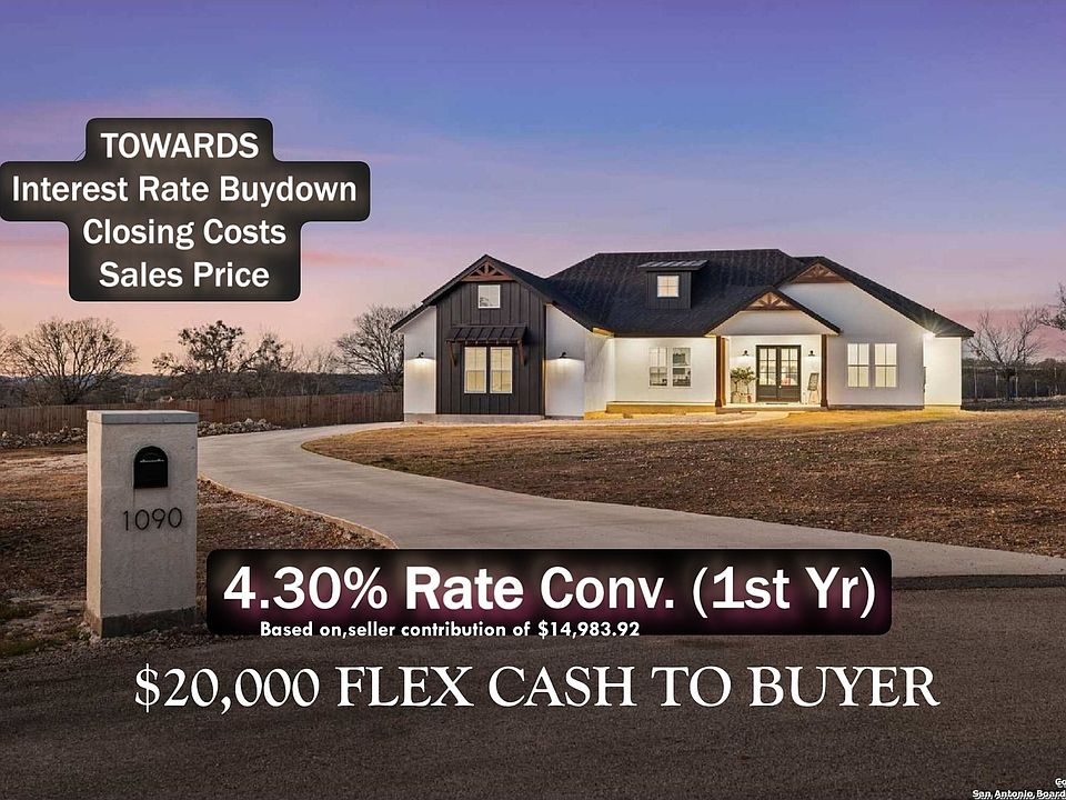$20,000 FLEX CASH To Buyer! Towards Interest Rate Buydown, Closing Costs, Sales Price! CUSTOM BUILT 2023! 2 MASTER BEDROOMS INCLUDED! RESORT STYLE/COUNTRY LIVING - MUST SEE!!! 1.07 ACRES, ONE STORY, 4 BED 3 1/2 BATH 2,700 SQFT. ON CUL-DE-SAC, ULTRA MODERN WITH ACCENTED HI-CEILINGS, LUXURY WOOD VINYL PLANK AND TILE FLOORS. CUSTOM DESIGNED CHEFS ISLAND KITCHEN, COUNTERTOPS, CABINETS, APPLIANCES. SPECIALLY DESIGNED MASTER BATH WITH CUSTOM BUILT SHOWER, DESIGNER TUB, CLOSETS, CABINETS! PERFECT FOR ENTERTAINING FAMILY AND GUESTS. RELAX ON THE COVERED PATIO OVERLOOKING THE PRIVATE BACKYARD BIG ENOUGH TO ADD A SWIMMING POOL AND MORE OR ENJOY THE SELF CONTAINED BATTING RANGE OUTBACK; ALSO, TAKE ADVANTAGE OF THE GATED COMMUNITY POOL/PAVILION PLUS THE RUNNING/JOGGING/DOG WALKING TRACK AND THE COVERED KIDSCAPE FOR HOURS OF FUN! COMMUNITY AMENDITIES A SHORT WALK AWAY OR DRIVE YOUR GOLF CART DOWN YOUNDER. A PHOTOGRAPHERS DREAM, WILDLIFE, BIRDS, FISH, VEGETATION, CANYON LAKE, MAJESTIC SUNSETS AND SUNRISES! NO COOKIE CUTTER HOMES HERE, NO CITY TAXES, LOTS OF GREAT HOA AMENITIES! MINUTES TO BORENE, SAN ANTONIO, NEW BRAUNFELS, SHOPPING, ENTERTAINING, FACTORY STORES IN SAN MARCOS. LOTS OF SCENIC BACK ROADS AND LITTLE TOWNS NEARBY TO EXPLORE IN CONVERTIBLE, MOTORCYCLE, BIKING, OR BOATING IN CANYON LAKE, HURRY!