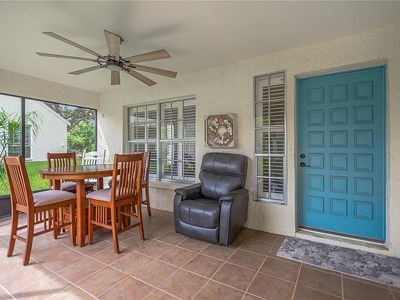 This magnificent 2-bedroom,2-bathroom villa, complete with a 1-car garage, is situated within the highly desirable 55+ community of Highland Lakes. The property features a newer kitchen equipped with stainless steel appliance, an elegantly updated master bathroom boasting a walk-in shower, and a beautifully refreshed guest bathroom with tub. The rear view overlooks the 6th tee, providing breathtaking sunset views. The front covered screened-in lanai offers a tranquil setting for relaxation or socializing with family and friends. Community amenities are plentiful, including three private golf courses, a heated pool and spa, tennis courts, pickleball courts, secure RV parking and boat parking, art studios, and an array of entertainment and social events. The Lake Tarpon Lodge amenities include heated pool, picnic and party facilities, a fishing pier and community pontoon boats. Additionally, it is worth noting that Golf Villas features its own community pool, conveniently located across the street within walking distance. If golfing, swimming and social activities are your passion, and you'd rather not deal with lawn upkeep or flood zone issues, then this is the home for you.