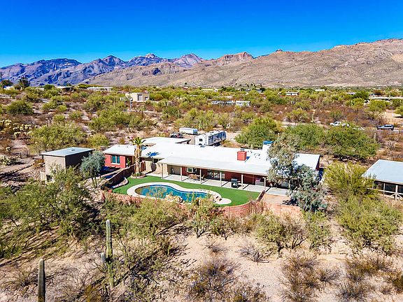 * Tanque Verde ranchette, featuring Tohono Chul ambiance, over 100 saguaros & over a quarter mile of handcrafted pathways meandering through 2.95 acres. Stop by the ramada & firepit as you journey through this dramatic landscape. Grand mountain vistas abound. Home has been remodeled from top to bottom: new kitchen, baths, floor coverings, cabinetry, appliances & fixtures, all tasteful & of high quality. Quartz countertops & soft close drawers are just some of the highlights. Main house features 5 bedrooms including home office. Great room style family room/breakfast nook/kitchen features wood burning fireplace. Separate private home office has guest suite potential. Laundry room is perfect as a cabana bath & has plumbing in place to add a shower.