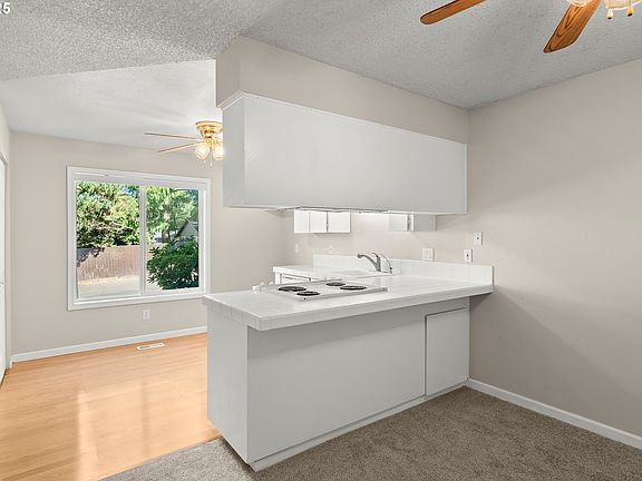 Tucked away in a very private location within a quiet complex, this home offers both comfort and convenience. Recent updates include a new roof, windows, and siding (2015), plus a furnace and water heater replaced in 2020 for peace of mind. Inside, enjoy brand-new carpet and fresh interior paint, creating a move-in-ready space. The kitchen offers a tile countertop, a convenient eating bar, and a spacious pantry. Upstairs, you’ll find two generously sized bedrooms and a full bathroom, providing comfort and functionality. Easily accessible laundry closet complete with washer and dryer hookups. PRIVATE FULLY FENCED PATIO is perfect for outdoor relaxation, while the front ramp can easily be removed if next buyer desires. A covered parking spot is deeded with the unit, adding extra value. Ideally located near Fred Meyer, shopping, and restaurants, with quick access to Hwy 99 and major freeways for an easy commute. The HOA includes sewer, water, and trash services.
