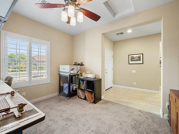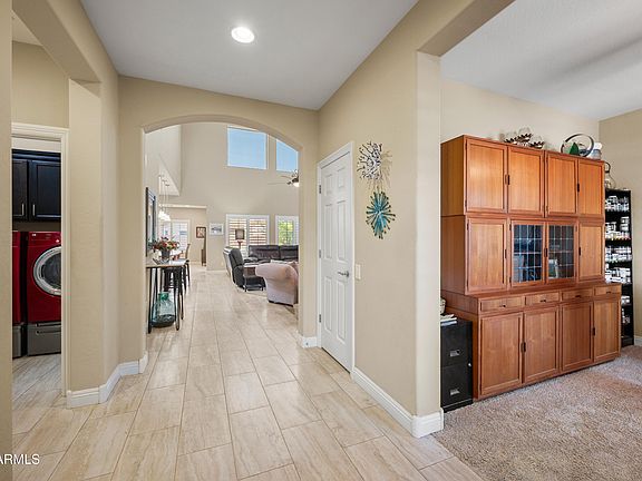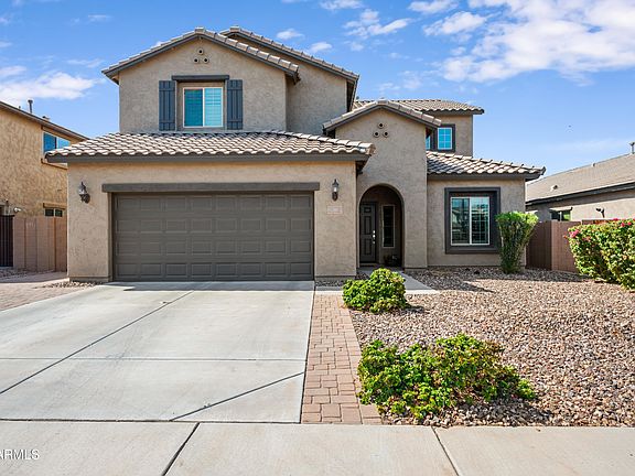 This exquisite 4-bedroom, 3.5-bathroom residence offers 2,693 sq. ft. of finely appointed living space with a split floor plan and a wealth of premium upgrades. Built in 2012 and meticulously maintained, the home perfectly balances modern elegance with everyday comfort inside and out. Interior Highlights- Primary Suite on Main Level for ultimate privacy, featuring en-suite bath and walk-in closet. Open Great Room with abundant natural light, pre-wired for surround sound upstairs in the Bonus Loft and downstairs. Gourmet Kitchen boasting espresso-stained raised & staggered cabinetry with crown molding, granite countertops, upgraded stainless steel appliances, GE Profile Gas Range, GE Profile Microwave that Bakes & Air Frys , and Kenmore Elite refrigerator. Upgraded Finishes throughout, including 4-inch plantation shutters, wrought iron & wood staircase railing, and tile accents. Spacious Laundry room with LG Tromm washer and dryer included with the home. Step Outside and enjoy Paradise with a Heated Pool built in 2024 that includes Pebble Sheen finishes, Sparkling Accents, adjustable pump, colored LED lighting, and extended travertine decking. This Pool is controlled by an application on your phone for your convenience. Professionally landscaped backyard with low-maintenance and a 14' x 20' Aluma wood Patio Awning for year-round outdoor living. Front Yard is professionally landscaped and offers extended paver driveway for additional parking. 3 Car Garage does include epoxy-coated garage flooring. Situated on a beautifully maintained lot in a sought-after Mesa community, this property offers proximity to parks, schools, shopping, dining, and quick freeway access making it ideal for both relaxation and convenience.