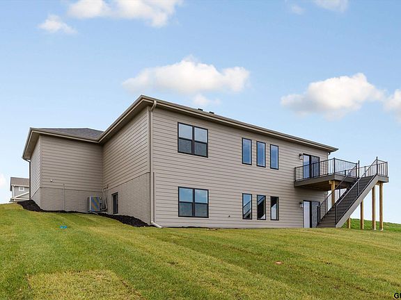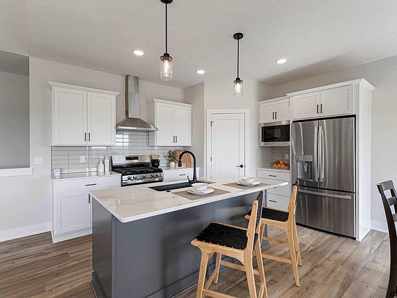 Built by THI Builders, this stunning 5-bedroom, 4-bath ranch in Kempton Creek (Bennington Schools) will make you do a double-take! Resting on a corner walkout lot with a 12' x 10' composite deck. The layout features three bathrooms on the main floor—a rare find! The primary suite includes walk-in closet that connects to the laundry room. Two additional main-floor bedrooms share a full bath, while a separate powder bath welcomes guests off the entry. The kitchen is loaded with quartz countertops, soft-close cabinetry, vented hood, gas range with stainless appliances (refrigerator included), pendant lighting. Downstairs, the fully finished walk-out basement adds a wet bar, bedrooms #4 and #5, and bathroom #4.Premium features include James Hardie cement board siding, tankless water heater & located near parks, schools and highway access!