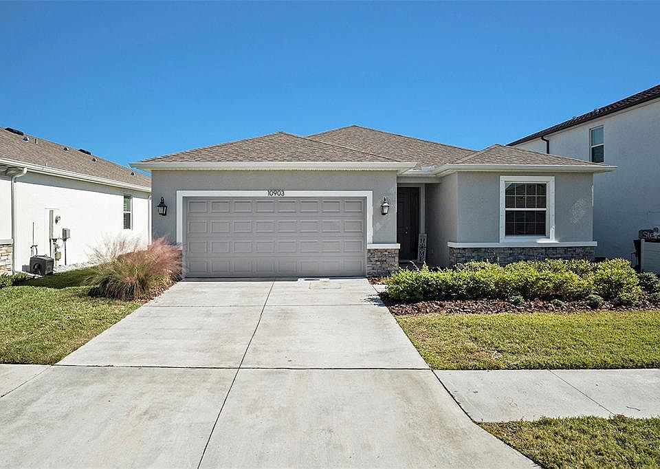 Welcome to your new home in the exclusive gated Allora community! Nestled on a quiet cul-de-sac within a community of just 149 pristine homes, this immaculate, move-in-ready concrete-block residence offers a rare blend of modern comfort and privacy. Built in 2020, this 4-bedroom, 2.5-bathroom home features a bright, open-concept floor plan designed for effortless entertaining and modern Florida living. The heart of the home is a chef-ready gourmet kitchen, featuring elegant quartz countertops, a designer backsplash, stainless steel appliances, and a large island perfect for casual seating. Recessed lighting and a spacious walk-in pantry complete this ideal gathering space. Modern ceramic tile flooring flows seamlessly through the kitchen, living, and dining areas, creating a functional and stylish environment. The thoughtfully designed split floor plan ensures maximum privacy. A spacious primary suite offers a true sanctuary, with two walk-in closets and a spa-like ensuite bathroom, featuring double vanities, a walk-in shower, and a luxurious soaking tub. Three additional bedrooms are situated towards the front of the home—one perfectly sized for a nursery or home office—providing comfort and flexibility for family or guests. Step outside to your ideal outdoor oasis: a covered lanai and private, fenced backyard await for relaxing or entertaining. For electric vehicle owners, the two-car garage is already equipped with a pre-installed 240V NEMA 14-50 outlet. Enjoy quick and convenient access to Westchase and the Veterans Expressway for seamless travel to Downtown Tampa, Tampa International Airport, St. Petersburg, Clearwater, and the Gulf beaches. The Upper Tampa Bay Trail is moments away, and abundant shopping and dining options are nearby in Citrus Park and Westchase. This well-maintained, nearly-new home offers the perfect blend of modern luxury and exclusive community living. Schedule your private showing today!