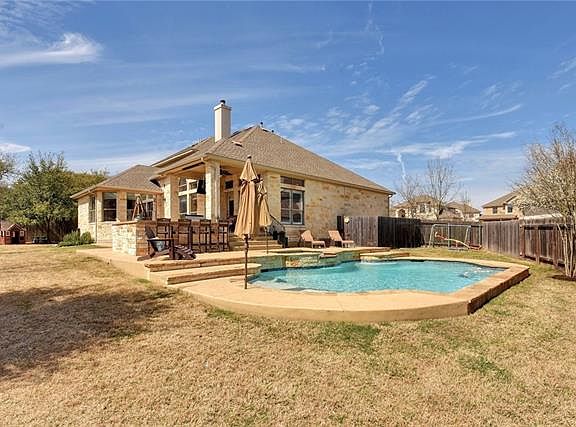 Beautiful Circle C Ranch home located on a private cul-de-sac w/ large back yard, sparkling blue pool, & hot tub. Perfect for entertaining, the outdoor living boasts a custom built counter top w/ built-in grill & perfect nesting space for your Green Egg. The open & functional floor plan offers the kitchen open to the family room, master suite, dedicated office, & formal dining downstairs w/ a game room, three bedrooms, & two full bathrooms upstairs. Custom Pool from Cody Pools.