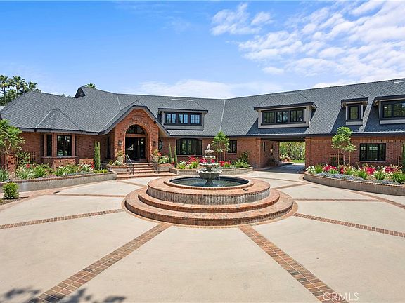 This luxurious, grandiose, and authoritative one-of-a-kind modernized Tudor estate home is exclusive, emanating opulence, exclusivity, and originality at every turn. Prepare to be dazzled by exceptional details and awe-inspiring craftsmanship that meld traditional and modern elements. Indulge in unparalleled luxury with over 10,000 sq ft of sumptuous living space, featuring a splendid living room with a wet bar perfect for entertaining, elegantly coved ceiling dining room, and an impressive hexagonal morning room that exudes grandeur. Savor the newly-renovated kitchen, showcasing a spacious waterfall center island, walk-in and butler's pantries. The family room is grand and Illuminated by walls of French doors framing scenic mountain vistas, a fireplace and breathtaking architectural detail and vaulted trussed ceiling. Experience the convenience of a well-appointed home office/library with custom woodwork, high trussed ceilings, arched doorways and a cozy fireplace. Upstairs, step into the extravagant primary suite with cathedral ceilings, a private balcony, retreat room and fireplace, a lavish bath boasting double sink vanities, and a third complete vanity area for makeup and hair, double walk-in closets and a luxurious soaking tub awaiting tranquility. The hallway will lead you to the elevator, a study station, laundry room and three guest en-suites and two additional guest ensuite available on the main level. The lower level includes a cedar wine cellar and tasting room, gymnasium, full bath, and dry sauna room. This remarkable property offers over two acres of seclusion and privacy, with orange groves, lush grounds, remarkable mountain views, a four-car garage, wood-paneled elevator, and horse-zoned wilderness. Indulge in leisure with the pool/guest house, tennis court, newly-built resort-style pool, spa, and terrace.The 24-hour guard gated community of Monteria Estates ensures privacy, security while being only minutes from fine dining, entertainment, shopping, world-class private schools and easy freeway access. You don't want to miss out on this incredible opportunity!