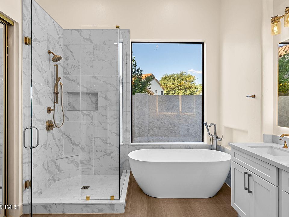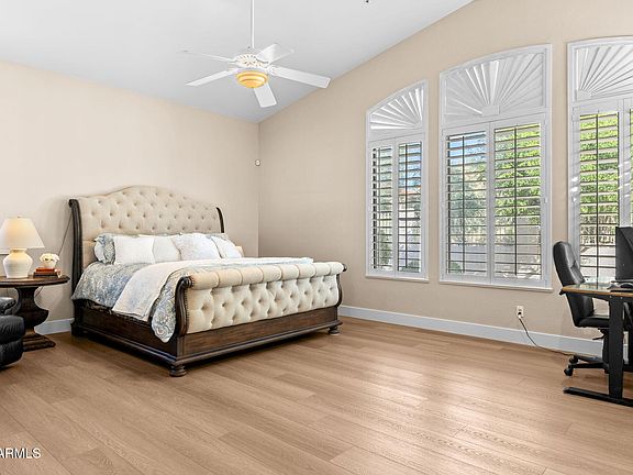 The oversized primary suite offers a luxurious private retreat with a completely remodeled spa-inspired bathroom. This gorgeous bathroom invites you to relax as you enjoy the latest in Brushed Gold faucets complemented by new white cabinetry, quartz counters and a beautifully tiled shower. Enjoy a chilled glass of wine from your 1,000-bottle climate-controlled wine room as you unwind in your resort-style backyard oasis. The outdoor living area includes a flagstone patio, sparkling heated pool with waterfall and spa, custom stainless-steel kitchen, fire pit, and a professional misting system ideal for year-round enjoyment. Additional upgrades include a tankless water heater, energy-efficient solar panels, and a rare 3-car garage. This home offers the perfect blend of luxury, comfort, and privacy, an exceptional opportunity in one of Scottsdale's premier neighborhoods!
