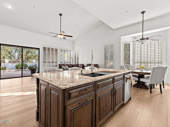Welcome Home to this beautifully upgraded, recently remodeled, single-story home in the highly sought-after Scottsdale Ranch community, perfectly positioned on a premium lot backing to a serene arroyo and unobstructed desert landscape. Step through a lush courtyard into an elegant formal living and dining room with Luxury Wood Look Vinyl stretches throughout the home and wall-to-wall glass doors invite the outdoor in and showcase the private views. The completely remodeled chef's kitchen is a showstopper, featuring designer cabinetry, exquisite granite countertops, and a striking backsplash. A large eat-at island opens seamlessly to the expansive family room and bright breakfast nook just perfect for entertaining. Vaulted ceilings, new upgraded baseboards, fresh interior paint and an... open, airy floor plan enhance the home's spacious feel.