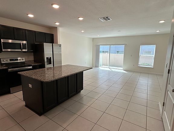 Large islandEn suite bathroomStone countersOversized storage closetWide open layoutCozy patioStainless appliances