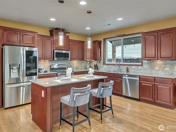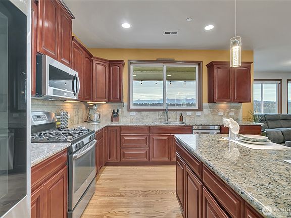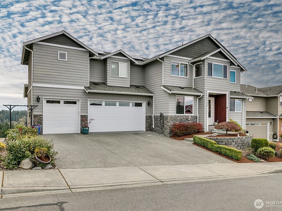 Perched at Bonney Lake's highest point; Custom residence in The Summit offers panoramic Mt Rainier, Cascasde & sweeping Port of Tacoma views. Grand entry leads to open-concept living w/slate stone, hardwoods & walls of windows framing breathtaking vistas. Gourmet kitchen features granite counters, SS appliances & formal dining. Lg Loft/Bonus upstairs w/picturesque views. Primary Suite w/linear fireplace & 5-piece ensuite bath. Office/opt. 5th Bed. Multiple entertaining spaces: Lower-lvl Jr Suite: Private ground-lvl entry, living rm, 2nd Primary ensuite w/full bath & WIC—ideal for guests or multi-gen living. 2 view decks overlook tiered landscaping & green house. 3-car gar, Heat Pump & gated cul-de-sac community. Award-winning Sumner Schools