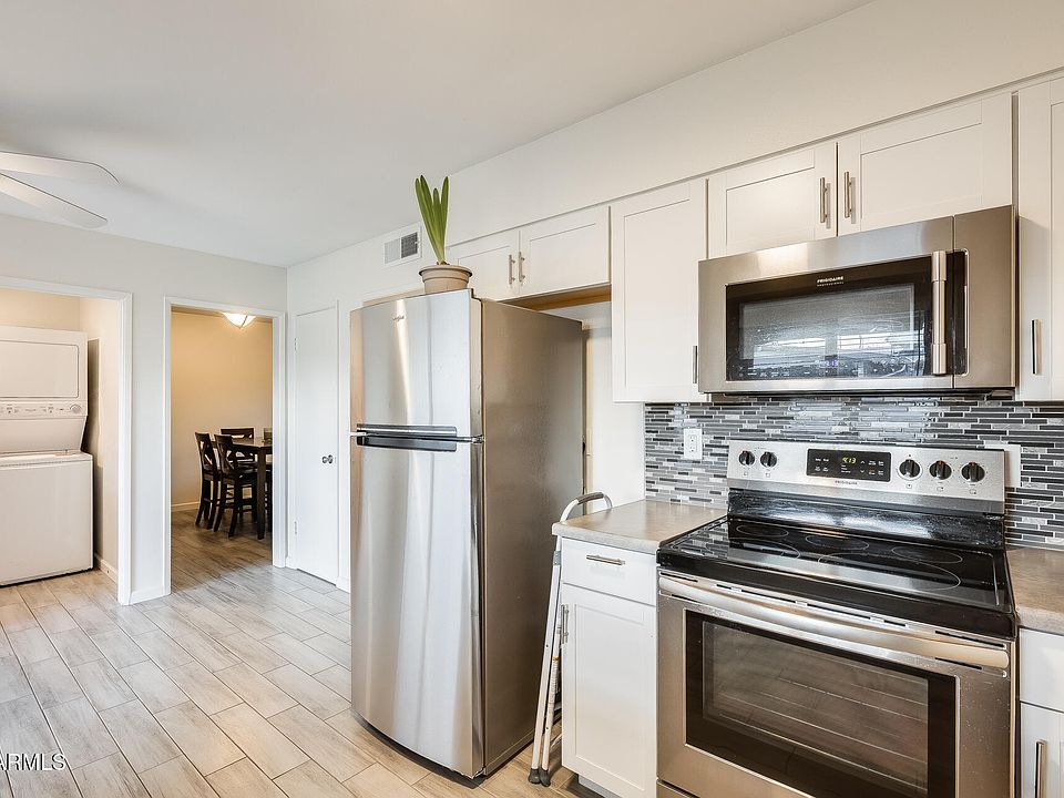 Beautifully landscaped communityStylish updated kitchenBright green grassy courtyardVibrant exterior paintHuge windowsChic glass tile backsplashWhite cabinets