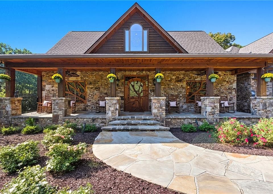 Stacked stone fireplaceExpansive deck spaceFront porchRich wood accentsMatching windowsExtra large dressing roomRich dark wood mantlepiece