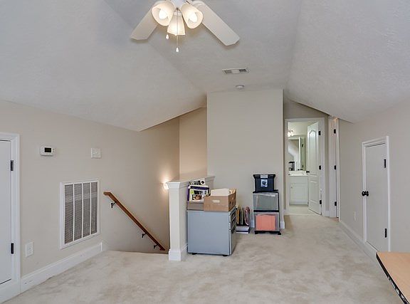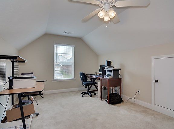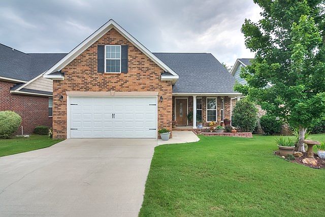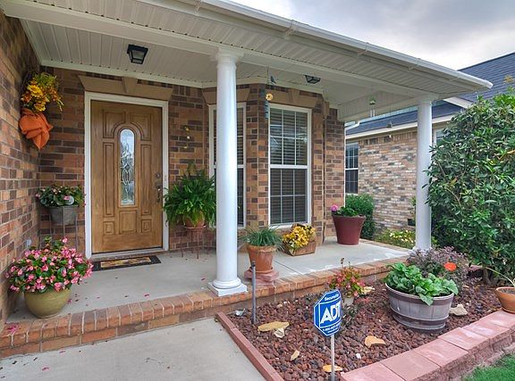 This cheerful 4 bedroom 3 bath home is designed with a brick exterior and warmly painted interior. The entrance leads into a cheerful dining room that features a bay window for plenty of natural lighting. The kitchen is outfitted with stainless steel appliances including a vent-hood microwave, smooth-top range and oven, dishwasher, and sink fixtures. Kitchen also features a long bar and tile backsplash. Beyond is an inviting great room with a vaulted ceiling and gas log fireplace surrounded by tile and encased in a stately wood mantle. The owner-bedroom features a tray-ceiling with recessed lighting and a walk-in closet. The owner bathroom includes tile flooring, a garden tub, dual sinks, and a shower with a sliding glass door. Bedrooms 2 and 3 include ceiling fans and spacious closets. Upstairs is a large bedroom with attached full bathroom that could also be used as a bonus room or office. The backyard features a covered wooden deck leading into a fenced yard.
