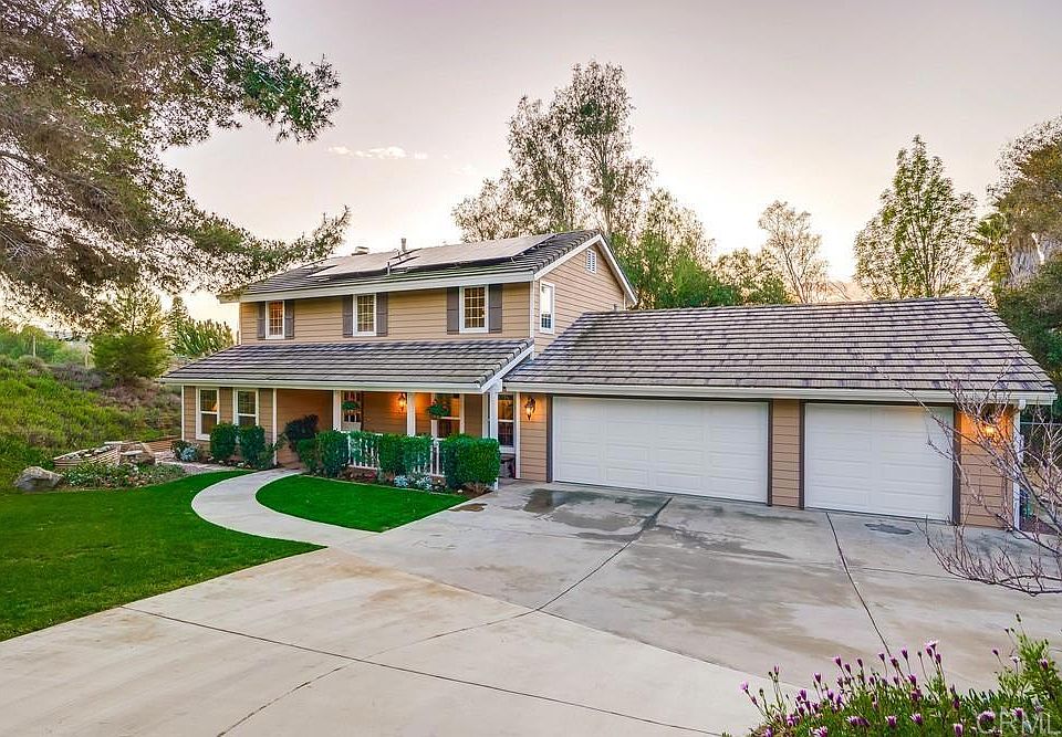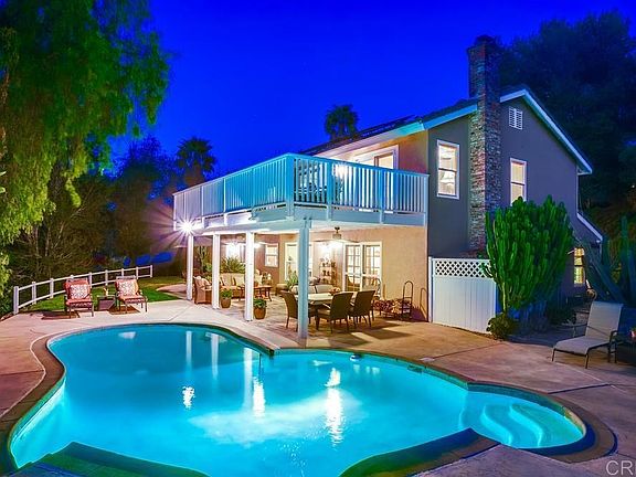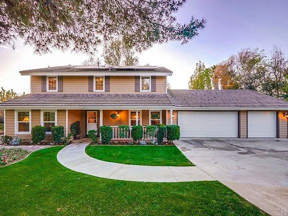 Welcome to this stunning two-story home nestled in the picturesque community of Fallbrook, California. Situated on a sprawling one acre lot, this four bedroom, two and one-half bathroom residence offers the perfect blend of comfort and tranquility with breathtaking views of the rolling hills. The property is beautifully landscaped, creating a serene and inviting atmosphere from the moment you arrive. The well-appointed kitchen features modern appliances, ample counter space. The cozy family room, conveniently located just off the kitchen, is the perfect place to relax and unwind. Featuring a charming wood-burning fireplace, it creates a warm and inviting atmosphere, ideal for cozy evenings with family and friends. French doors open up to the backyard oasis, seamlessly blending indoor and outdoor living. The separate dining and living rooms gives you plenty of room to spread out in the home. The large primary suite provides a peaceful retreat with stunning views of the surrounding hills, a walk-in closet, and an en-suite bathroom with dual vanities and a separate shower. The additional three bedrooms offer plenty of space for family or guests. Step outside to your own private oasis. The beautifully landscaped backyard features a sparkling pool with an attached spa and a wonderful outdoor living space, perfect for relaxing or hosting summer gatherings. With a large covered patio, you can enjoy alfresco dining while taking in the serene, panoramic views. This home also boasts an oversized 3-car attached garage, providing ample room for your vehicles, storage, or even a workshop. This home is equipped with a fully paid-off solar system, offering you the benefits of sustainable energy and significantly lower utility costs. The lower area of the property has a wonderful horseshoe pit or could be converted to a large garden or even possibly add an ADU. The property is located at the end of of a cup de sac, is fully fenced, and has a beautiful automatic entrance gate. With its prime location in Fallbrook, you'll enjoy a tranquil, rural setting while still being conveniently close to schools, shopping, and dining.