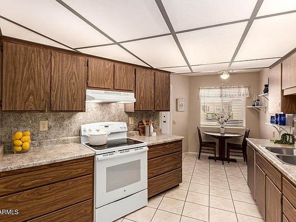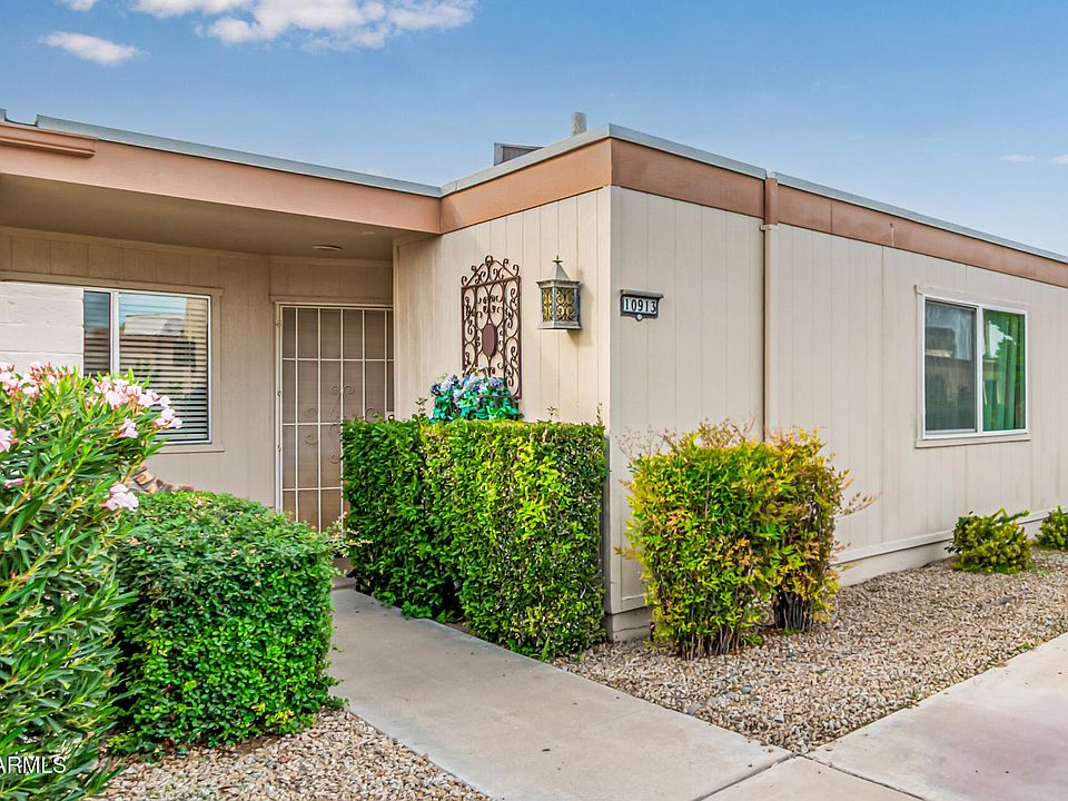 Experience vibrant adult living in this end-unit apartment in Sun City! You're welcomed by an inviting front patio perfect for enjoying morning coffee. Discover a spacious living room with high ceilings, a soothing palette, blinds, and soft brand-new carpeting for added comfort. The eat-in kitchen comes with flat-panel cabinetry and essential built-in appliances for an enjoyable culinary experience. The bedroom is cozy and well-sized, offering a private retreat for a good night's sleep. Spend relaxing afternoons on the covered patio, ideal for reading a captivating book or sipping on your favorite refreshing drink. New roof done March 2023 with a 10-year transferable warranty.