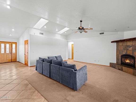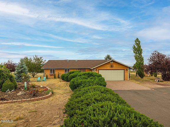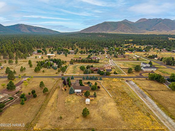 Welcome to this stunning single-level 4-bedroom, 2-bathroom home with breathtaking views of the San Francisco Peaks and Mount Elden. Perfectly designed for comfort and functionality, this property offers both everyday ease and unique features that make it truly special. The heart of the home is the spacious kitchen with rich hickory cabinets, opening to a large great room centered around a beautiful slate fireplace. Just off the kitchen, you'll find a charming sunroom ideal for nurturing plants or relaxing with a good book. The primary suite includes a thoughtfully designed bathroom with a walk-in bathtub and separate shower. Outside, enjoy two versatile sheds, including a remarkable with a retractable roof formerly used as an observatory with a telescope. Perfect for dark sky enthusiasts