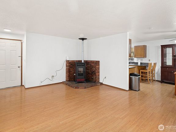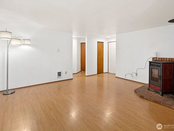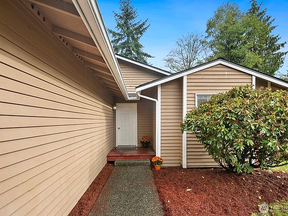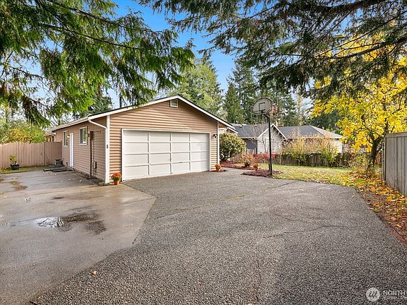 One level home, nestled in a quiet cul-de-sac, with a Brand New Comp Roof! Freshly Painted Family and Dining rooms, Kitchen and Hallway, Including Ceilings! 3 bedrooms with 3/4 bath off primary and full hall bath. Kitchen with skylight and adjacent dining room. Hardwood laminate floors throughout! Family room connects to a Huge Covered Deck, an ideal area for gathering and entertaining and enjoying the outdoors, even on rainy NW days! Large size lot, Fully Fenced, with a Big Storage Shed, also with a New Roof! 2 car oversized attached garage and plenty of extra parking on driveway. RV parking next to garage! Apple, pear and plum trees! Close to shopping and park and ride!