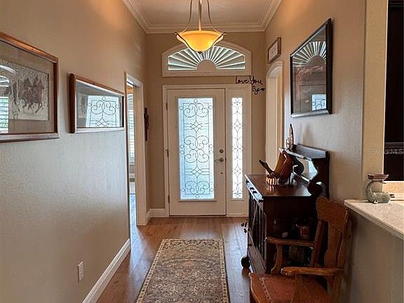 Prepare to be impressed by this absolutely beautiful expanded Gardenia model perfectly situated on a large corner lot in one of The Villages’ most convenient locations. This exceptional home is packed full of upgrades and elegant design touches throughout.The open floor plan is enhanced by the expanded width of the home, making the Living and Dining Rooms feel extra spacious and ideal for entertaining. Engineered French oak flooring flows through the main living areas, while tile adds practicality and style to the wet spaces. The eat-in Kitchen is truly a showstopper, featuring staggered cabinets with crown molding, quartz countertops, stainless steel appliances, a large island with pendant lighting, a breakfast bar, and a cozy nook for casual dining.The Main Bedroom Suite is large and inviting, featuring a tray ceiling, dual closets, and a luxurious en-suite bath with two vanities, abundant storage, a Roman shower, and a private water closet. The front Guest Suite offers its own en-suite bath with shower and a spacious walk-in closet—perfect for visiting family or friends.Down the hall, is the third Bedroom with vaulted ceiling and full Guest Bath. This area is made private by a pocket door and is on the opposite side of the home from the Main Bedroom.The Lanai is glass-enclosed with tile flooring and a dedicated split A/C unit, creating a comfortable year-round retreat. Telescoping sliding doors from the Living Room open fully to this space, offering a seamless indoor-outdoor flow. The Laundry Room is conveniently located off the Kitchen and features cabinetry and a wash sink for added functionality.Additional features include plantation shutters throughout, three solar tubes, transom windows in multiple rooms, and deep crown molding that gives the home a true custom feel. The spacious two-car garage plus golf cart garage provide plenty of parking and storage space.The exterior is just as impressive, with professional landscaping that includes stacked stone borders, lush palms, and a welcoming fountain at the entrance—all creating beautiful curb appeal. This home’s location is ideal, close to shopping, golf courses, recreation, pools, and mailboxes.This meticulously maintained and thoughtfully upgraded home offers elegance, comfort, and convenience all in one. Schedule your private showing today—you’ll be glad you did!