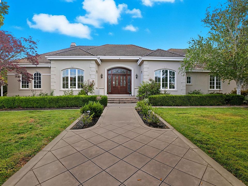 Single-story living in the prestigious gated community of Ruby Hill that backs to the golf couse and pond. This beautiful home offers 4 bedrooms and 3.5 bathrooms. The dining room, family room and living room are all complemented by newly installed stylish premium laminate floors. The kitchen, with views of the golf coures and a pictureque backyard, features a pantry and central island and refinished cabinets. The 5th bedroom is used as an office with customed desk and book shelf. Additional features include a dedicated handicaft room. The primary suite is a sanctuary, boasting two walk-in closets and a luxurious bathroom with dual vanities. The backyard, overlooking the 2nd fairway, features an outdoor BBQ and a fish pond. The oversize lot includes mature landscaping with 64 Primitivo grapevines in a private vineyard setting. This energy-efficient home benefits from leased solar panels with very low rate and includes a 3-car garage. As part of the Ruby Hill community, enjoy exclusive amenities such as a clubhouse, playground, pool, tennis courts, BBQ area, and 24-hour security. Welcome to your dream home. https://www.1092piemontedr.com/unbranded