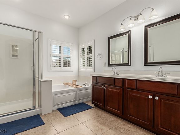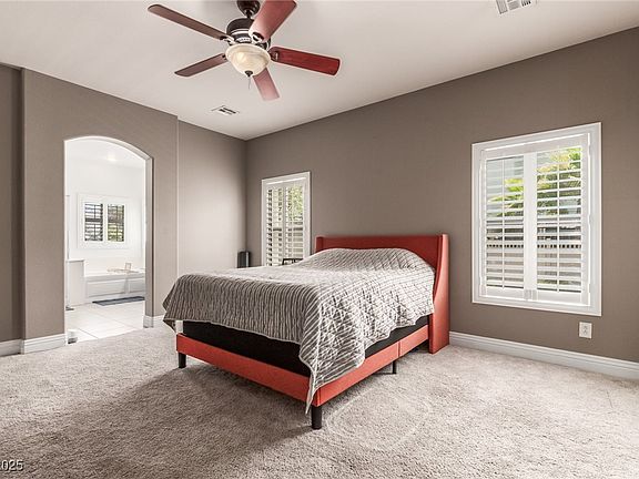 Welcome to this beautifully upgraded 2-story townhouse located in the gated community of Paradise Ranch in Henderson. The gourmet kitchen features sleek granite countertops, stainless steel appliances, and opens seamlessly to the living and dining area—perfect for entertaining. Downstairs you'll find a convenient guest bedroom with a full bath, ideal for visitors or multi-generational living. Upstairs, the oversized primary suite offers a walk-in closet and a luxurious ensuite bath complete with a jetted soaking tub and separate walk-in shower. The secondary upstairs bedroom also includes a private bath and walk-in closet, providing comfort and privacy for all. Additional features include elegant shutters throughout, ceiling fans in every room, and a prime location just steps away from the sparkling community pool. Don't miss the opportunity to own this turn-key home in a quiet and beautifully maintained neighborhood!