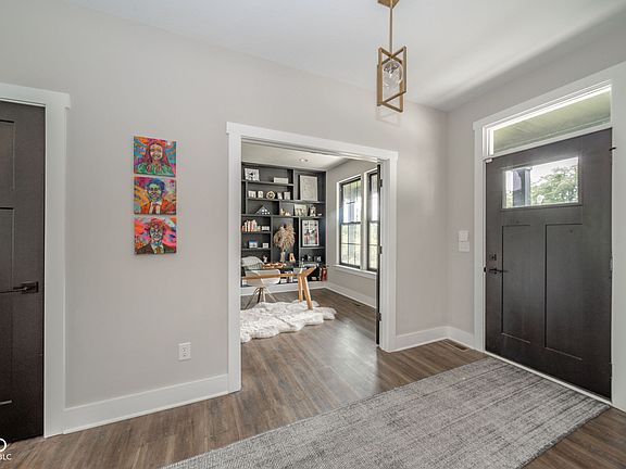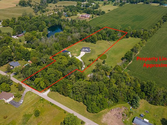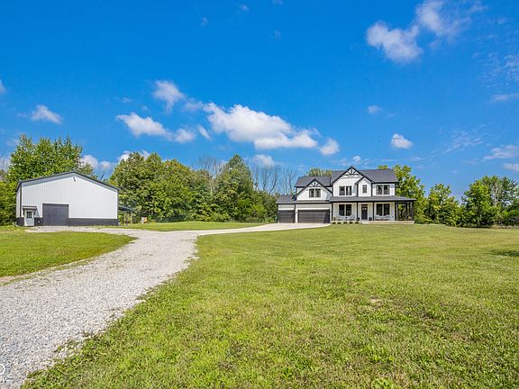 Built in 2022, this beautiful home boasts four bedrooms and three full bathrooms. The house sits on 5.03 private acres on the south end of New Castle with the possibility of an additional 5 acres. Top end finishes throughout the open main level. Gorgeous kitchen with quartz countertops, large island, custom cabinetry, and spacious pantry. Huge living room, formal dining area, den/office, and nicely sized laundry room make up the remainder of the main level. Upstairs you will find an amazing main bedroom with luxury en suite. There are three other bedrooms as well as a 17 x 14 landing for additional living area. Three car attached garage. Enjoy the outdoors under the covered front porch or partially covered and open patio in the back. 48 x 40 Pole Building with concrete flooring and 200 AMP service.
