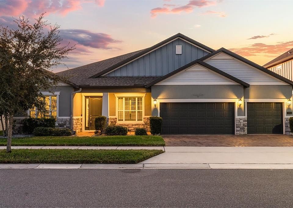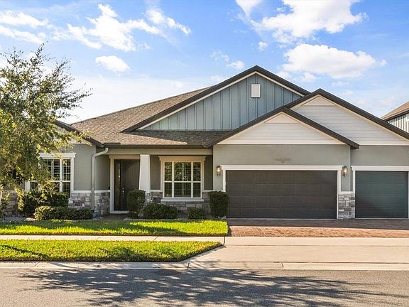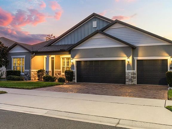 Experience resort-style living every day in this stunning Meritage Homes masterpiece, perfectly situated on a premium waterfront lot in the highly sought-after Water’s Edge section of Hawk’s Crest. This elegant home offers breathtaking pond and fountain views, especially enchanting at sunset, and an unparalleled combination of luxury, comfort, and energy efficiency. Step into your private outdoor oasis featuring a custom screened, saltwater, self-cleaning pool and spa with electric heat, LED color-changing lights, and an illuminated screen enclosure that creates an unforgettable nighttime ambiance. The expanded patio includes a custom outdoor kitchen complete with Quartz counters, stainless grill with hood, Green Egg, refrigerator, sink, backsplash, and ample cabinetry—perfect for entertaining family and friends. Enjoy beautifully manicured landscaping, French drains to the pond, and gutters for worry-free maintenance. Inside, sophistication meets comfort. The home features 10-foot ceilings, 8-foot doors, wood plank tile flooring throughout (no carpet), and plantation shutters in all main living areas, besides the Living room. Elegant crown molding, neutral Sherwin Williams paint, and upgraded lighting and fans add to the refined atmosphere. The chef’s kitchen is a showstopper with solid wood, soft-close shaker cabinets, Quartz countertops, a large island with breakfast bar, pendant and recessed lighting, stainless steel LG and KitchenAid appliances including a double oven, tile backsplash, a walk-in pantry, and a separate Butler’s pantry for additional storage and prep space. This desirable 3-way split floor plan offers privacy for everyone. One secondary bedroom enjoys its own private bath, while two others share a beautifully appointed pool bath featuring Granite counters, shaker cabinetry, and a tiled shower. The dedicated office with double French doors is ideal for working from home. The spacious primary suite is truly a retreat with its own views to the pool area, a luxurious en suite bath featuring double vanities, Granite counters, a garden tub, walk-in shower with glass panels, private water closet, and a custom walk-in closet system that will impress. Additional highlights include: • Laundry room with cabinetry and plumbing for a utility sink • 3-car garage with epoxy flooring and mounted television • All televisions convey, including the outdoor-rated SunbriteTV • Carrier HVAC systems for comfort and efficiency • Recently painted garage doors • Recently cleaned and sealed pavers front and back • Pet screen at bottom and a few side panels of pool Residents of Hawk’s Crest enjoy resort-style community amenities, including a community center with gym, resort pool with a splash pad, elegant clubhouse, multiple playgrounds, dog park (just three doors down!), cornhole area, hammocks, and grilling/picnic areas. Take a relaxing stroll on the private boardwalk to Lake Howell, where you can fish, kayak, paddleboard, or watch the sunset from the gazebo. This gated community with a virtual guard offers both privacy and peace of mind. Don’t miss your chance to own this one-of-a-kind home that perfectly blends elegance, functionality, and the best of Florida living. All you need to do is hire the movers!