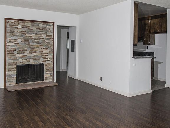 Granite countertops, laminate flooring, stainless appliances, a wood burning fireplace, courtyard facing balcony. 1 parking space.